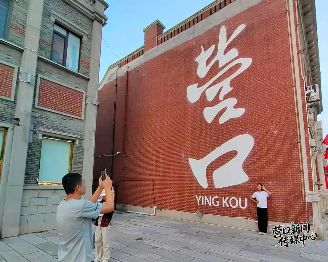 不远处的网红打卡墙同样颇具人气,红色墙体上“营口”二字格外醒目,游客们摆出各种创意姿势拍照留念。