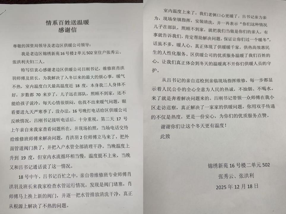 在锦绣新苑,70多岁的张秀云、张洪利夫妇因暖气不热犯愁,室内温度最高仅18℃,且二人子女远在部队,无人照料。12月16日,夫妇俩向老边区供暖公司反映情况后,供暖公司高度重视,次日便上门排查问题,更换管道阀门、清理入户水管。面对后续水流循环慢的问题,供暖公司再次上门服务,从根源上解决了供暖难题,让老人家中温度回升,更让老两口心里倍感温暖。