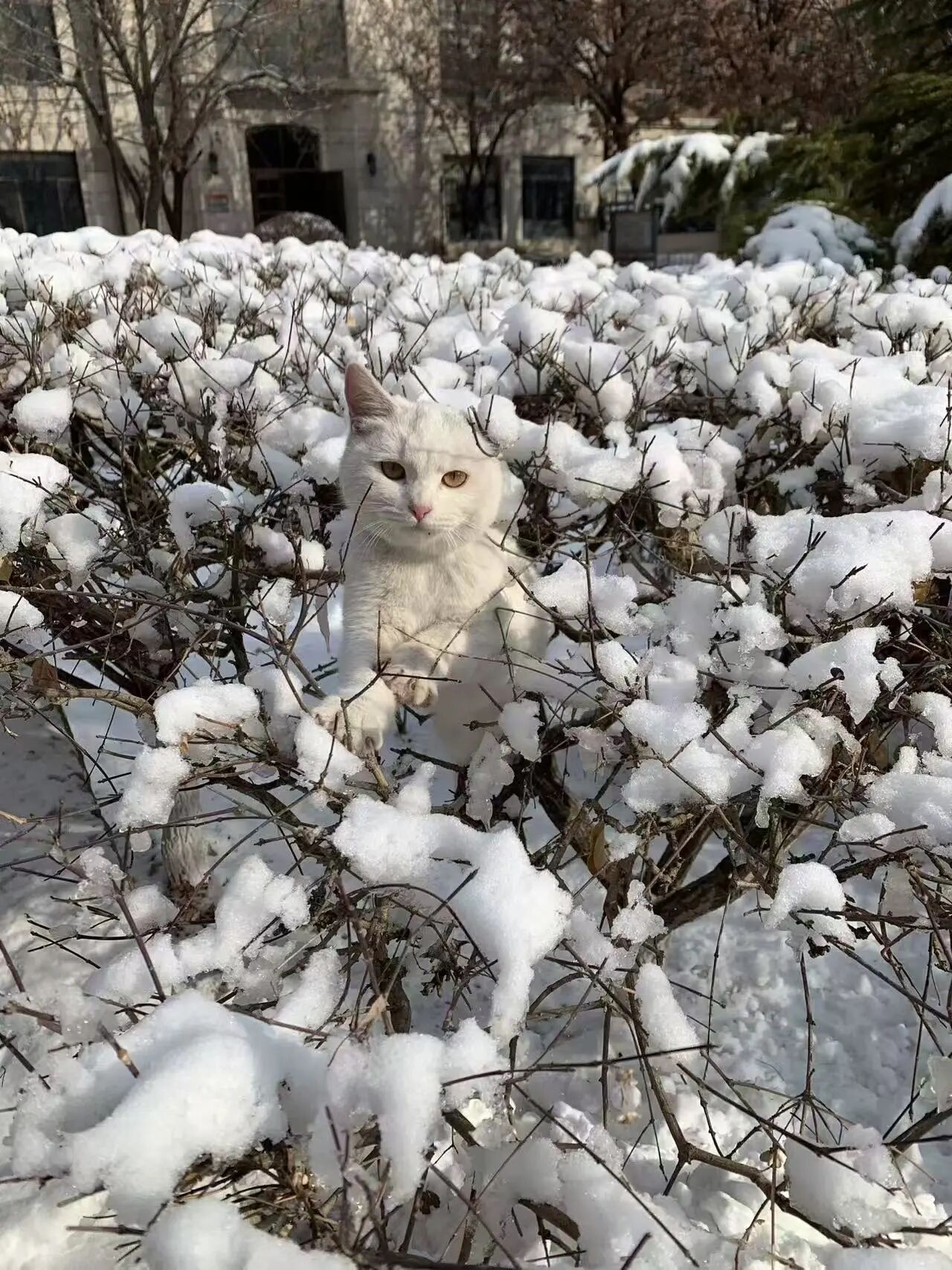 雪裹满枝桠时,我撞见一只偷享冬日时光的白猫,它超有“气质”!--@ZT小公主